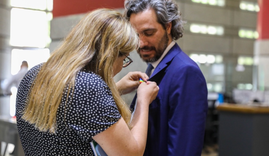 El canciller Santiago Cafiero, junto a la representante Especial sobre Orientación Sexual e Identidad de Géneros de la cartera de relaciones exteriores, Alba Rueda, presidió la ceremonia oficial por la celebración del Mes del Orgullo en la Argentina, acto durante el cual, además, se intervino el banco de la diversidad emplazado en la plaza seca del Ministerio.